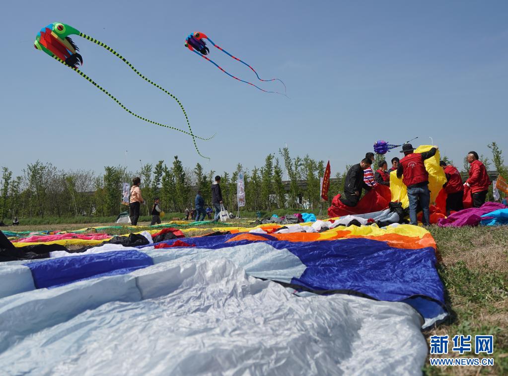 4月10日,人們?cè)诘诙媒鹆觑L(fēng)箏會(huì)上放風(fēng)箏。當(dāng)日,第二屆金陵風(fēng)箏會(huì)在江蘇省南京市浦口區(qū)永寧街道舉行。人們放飛風(fēng)箏,歡度快樂(lè)時(shí)光。新華社記者 季春鵬 攝