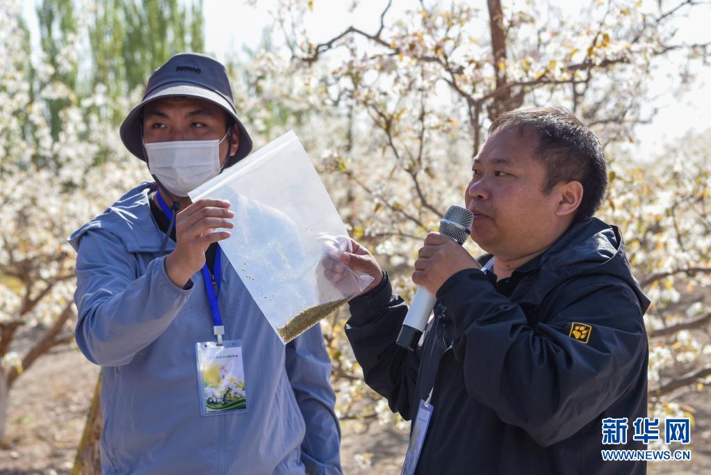 4月11日,在鐵門關(guān)市一處香梨示范園,技術(shù)人員展示蜜蜂采集的高活性花粉。新華社記者 丁磊 攝