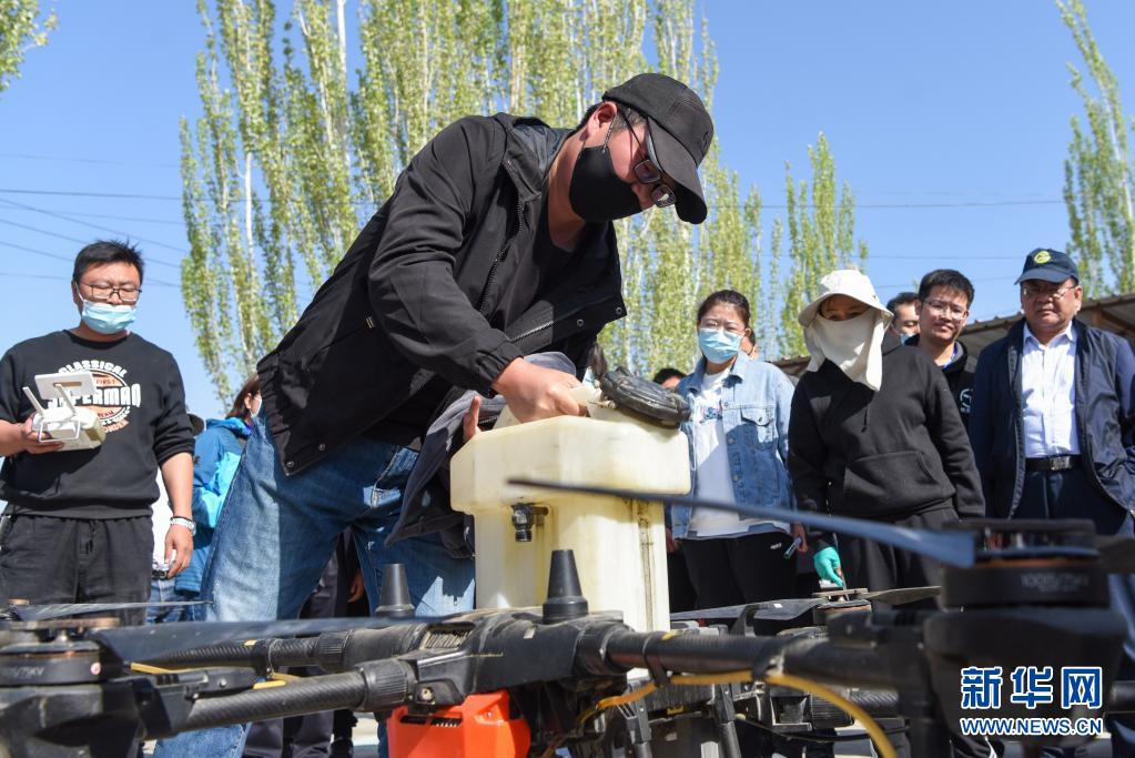 4月11日,在鐵門關(guān)市一處香梨示范園,技術(shù)人員將配制好的花粉稀釋液裝入植保無人機(jī)。新華社記者 丁磊 攝