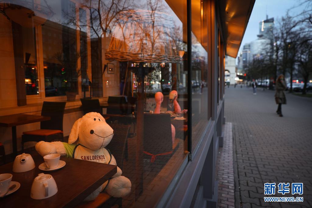 4月13日,波蘭首都華沙一家餐館將動(dòng)物玩偶擺放在靠窗座位上吸引顧客。
