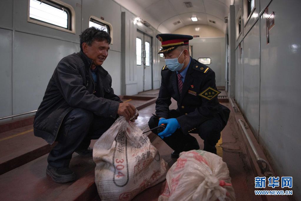 在5633次列車的“行李車廂”內(nèi),中國鐵路成都局集團公司成都客運段5633/5634次列車長劉偉(右)了解村民攜帶牲畜情況(4月11日攝)。新華社記者 胥冰潔 攝