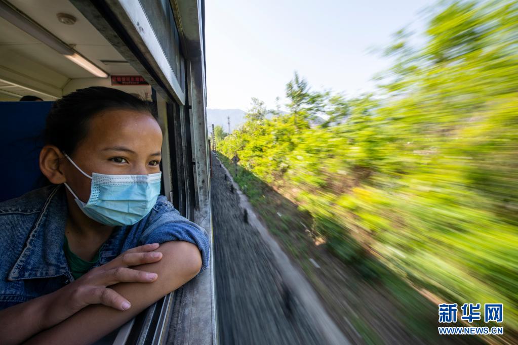 在乘坐5633次列車(chē)從家返校途中,一名學(xué)生望著窗外的風(fēng)景(4月11日攝)。新華社記者 沈伯韓 攝