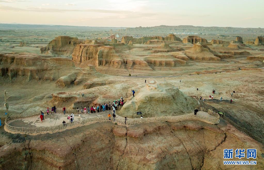 游客在新疆克拉瑪依烏爾禾世界魔鬼城景區(qū)內(nèi)欣賞日落(6月21日攝,無人機(jī)照片)。