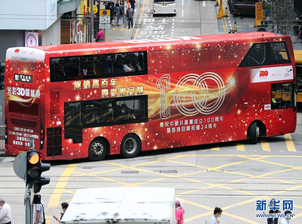 6月29日在香港街頭拍攝的公交巴士上的慶祝標(biāo)語(yǔ)。