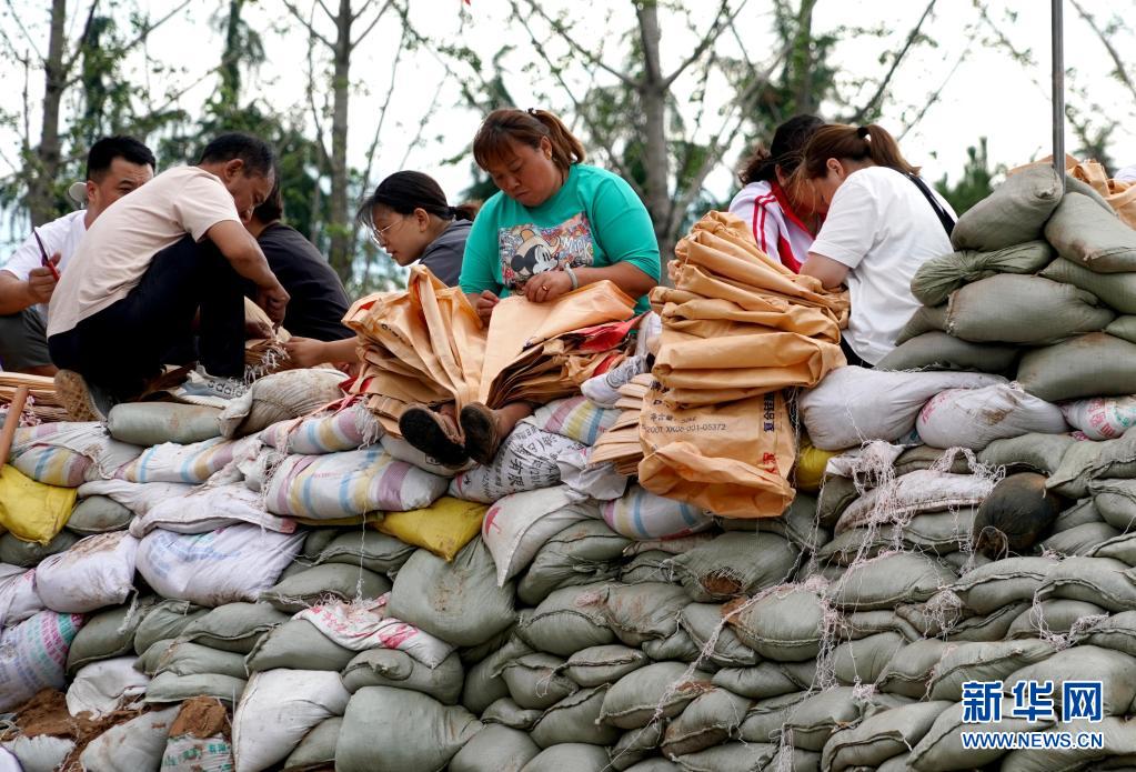 當日,在河南省鶴壁市浚縣傅莊堤上,不少群眾自發(fā)前來和救援人員一起裝沙袋、運沙袋,共筑堤壩。受持續(xù)強降雨影響,??h防汛形勢嚴峻,傅莊堤主要為??h縣城及26個村莊提供保護。新華社記者 李安 攝