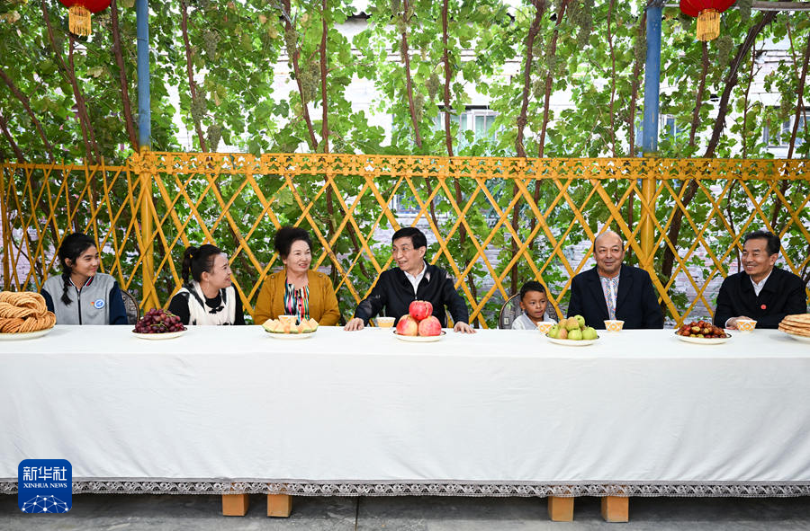 9月25日下午,受习近平总书记嘱托,中共中央政治局常委、全国政协主席、中央代表团团长王沪宁带领中央代表团部分成员在巴音郭楞蒙古自治州库尔勒市看望慰问当地各族干部群众。这是王沪宁和中央代表团部分成员在库尔勒市阿瓦提乡吾夏克铁热克村了解乡村产业发展和群众生产生活情况。