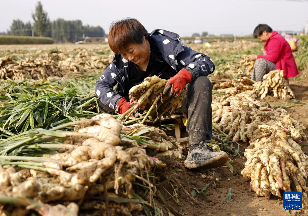 10月26日,河北省唐山市丰南区大新庄镇的农民在田间收获生姜。