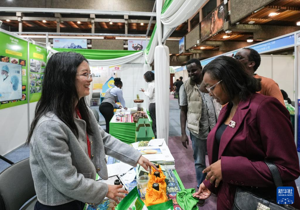 10月28日,在肯尼亚首都内罗毕举行的2025非洲国际农业博览会上,展商向来宾介绍产品。