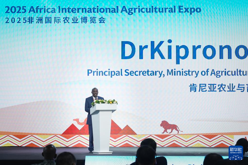 10月28日,在肯尼亚首都内罗毕,肯尼亚农业与畜牧业发展部常务副部长基普罗诺·罗诺在2025非洲国际农业博览会开幕式上致辞。