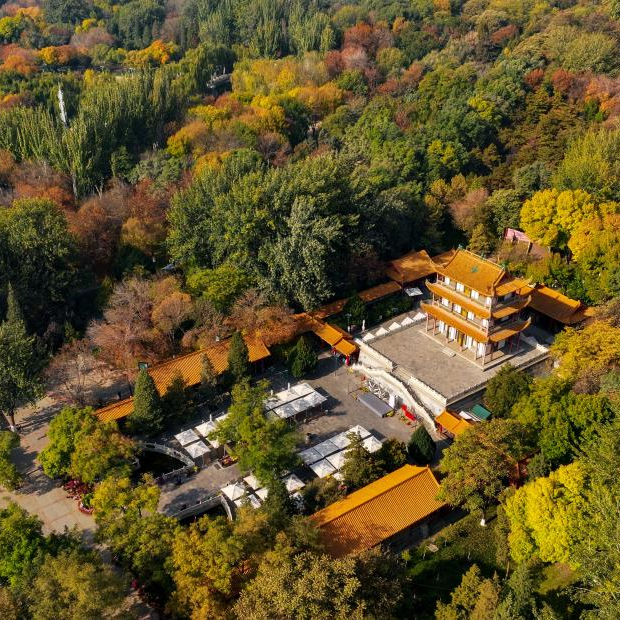 这是10月27日在银川市中山公园文昌阁拍摄的秋景(无人机照片)。