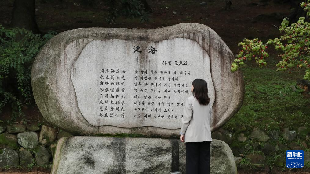 10月16日,游客在韩国庆州的上书庄前欣赏崔致远的代表作《泛海》。