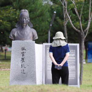 10月17日,市民在韩国庆州的“韩中友好林”公园里的崔致远铜像前观看崔致远生平介绍。