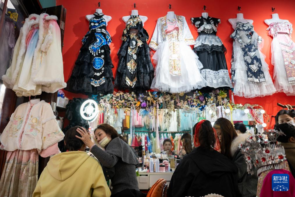 10月29日,游客在羊楼洞古街一家旅拍店化妆。