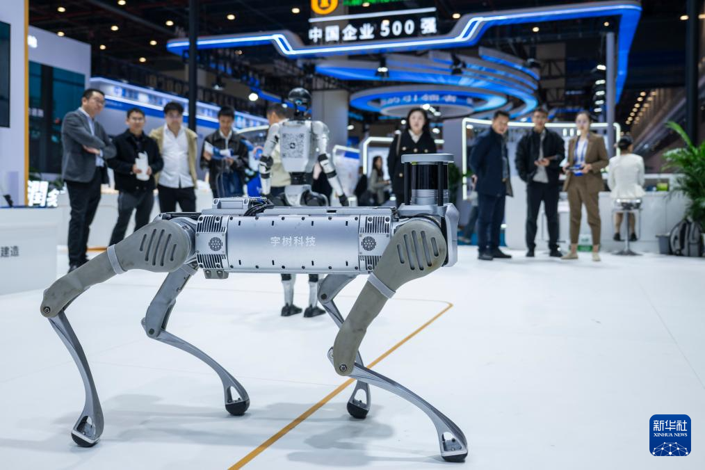 10月31日,观众在博览会现场参观宇树科技的智能机器狗。