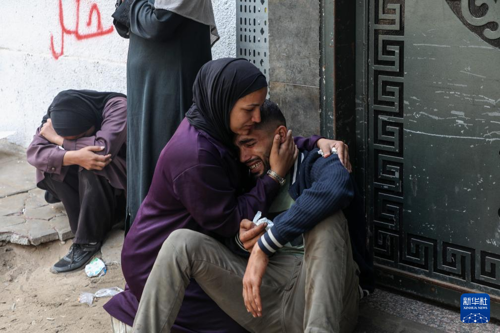 10月29日,巴勒斯坦人在加沙城的希法医院痛哭,哀悼在以色列空袭中死难的亲友。