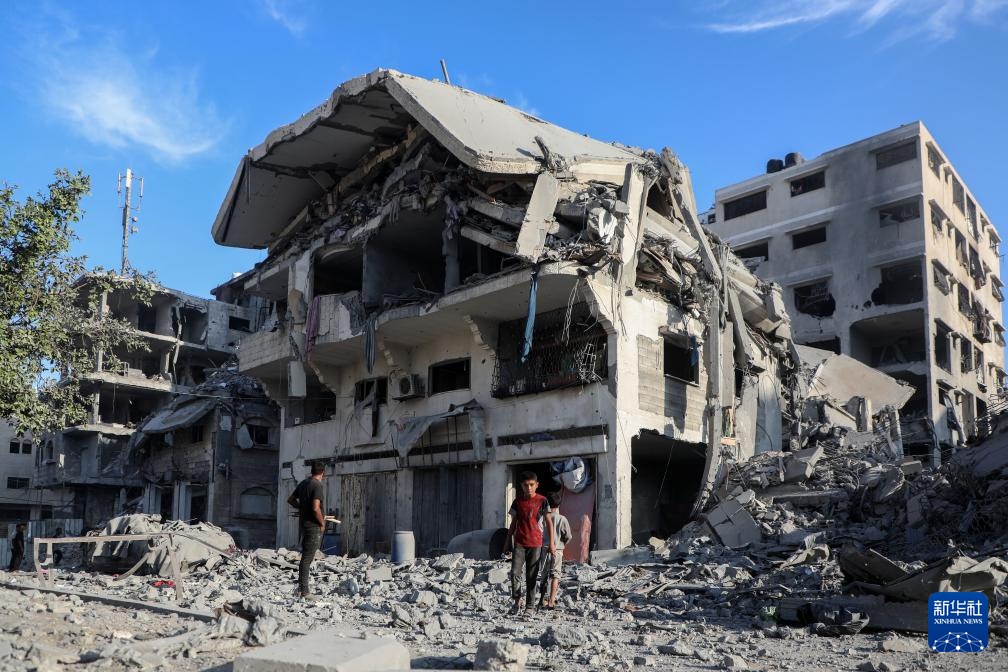 10月29日,巴勒斯坦人在加沙城查看遭以色列军队空袭后的废墟。
