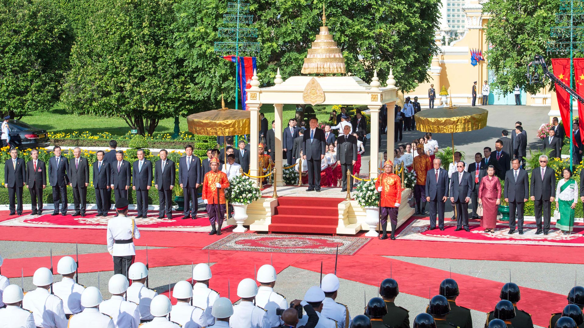 10月13日,國(guó)家主席習(xí)近平在金邊會(huì)見(jiàn)柬埔寨國(guó)王西哈莫尼。會(huì)見(jiàn)前,習(xí)近平出席西哈莫尼在王宮舉行的盛大歡迎儀式。 新華社記者 王曄 攝