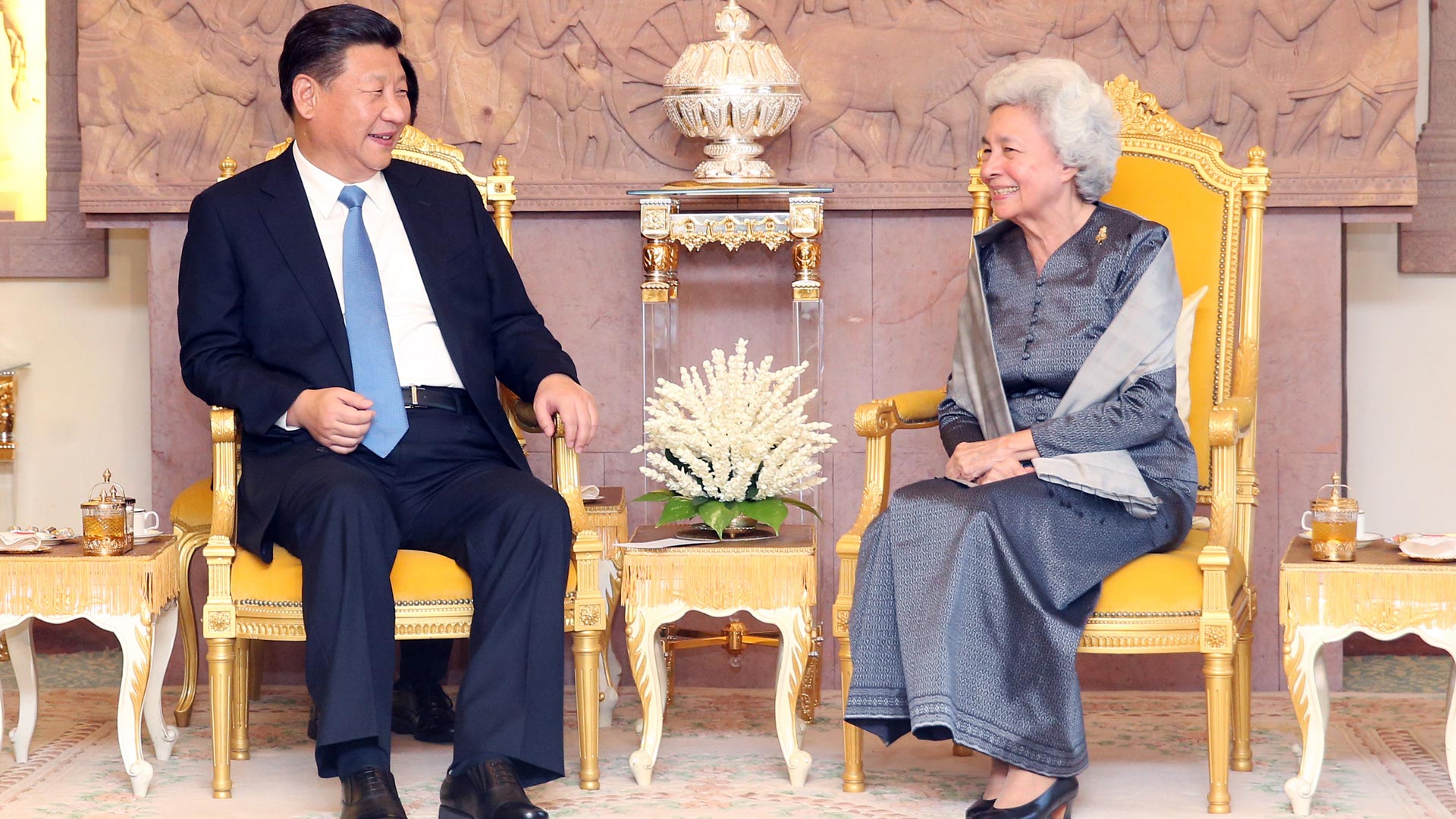10月13日,國(guó)家主席習(xí)近平在金邊看望柬埔寨太后莫尼列。新華社記者 姚大偉 攝