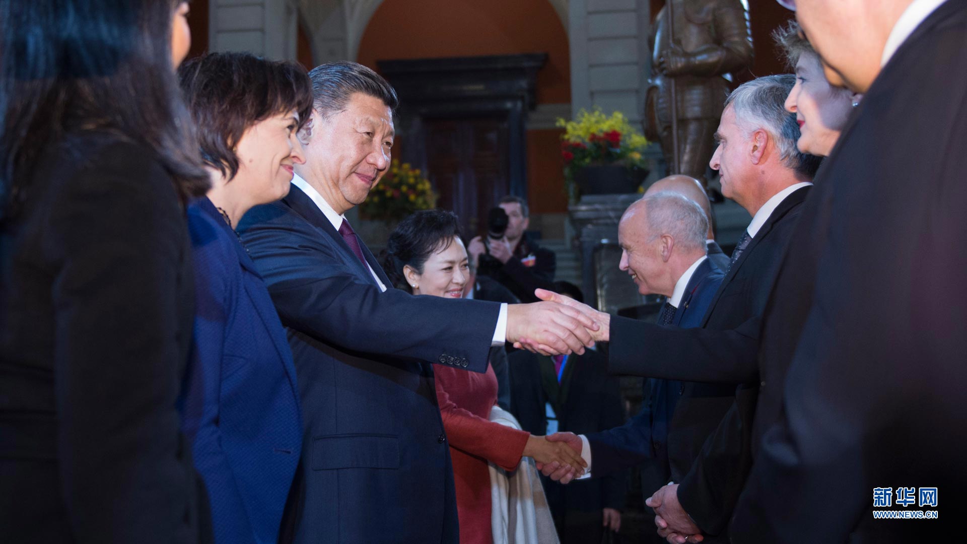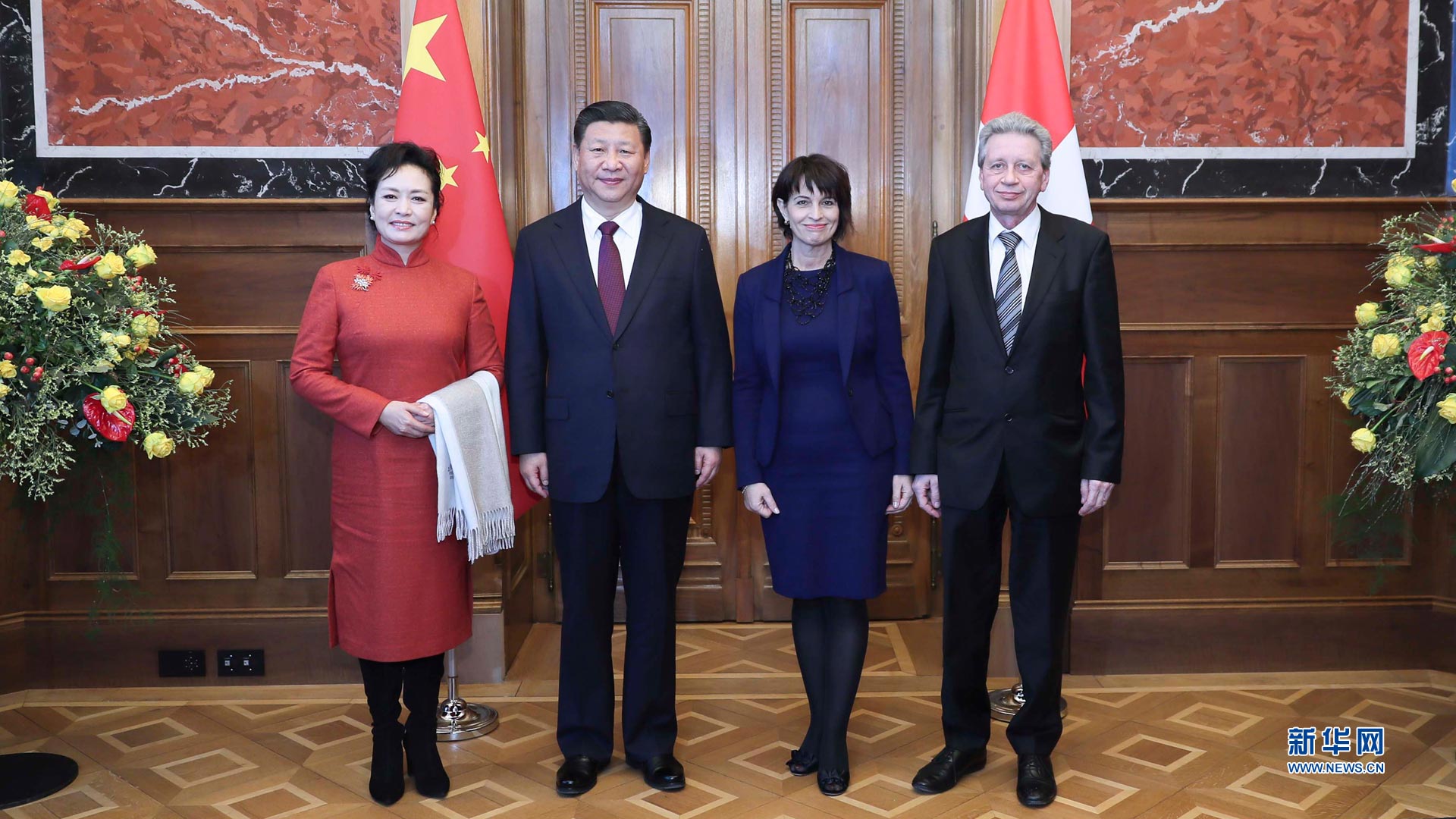 1月15日,國(guó)家主席習(xí)近平在伯爾尼出席瑞士聯(lián)邦委員會(huì)全體委員集體舉行的迎接儀式并致辭。這是瑞士聯(lián)邦主席洛伊特哈德夫婦在聯(lián)邦大廈迎接習(xí)近平和夫人彭麗媛。 新華社記者蘭紅光攝2017-01-16