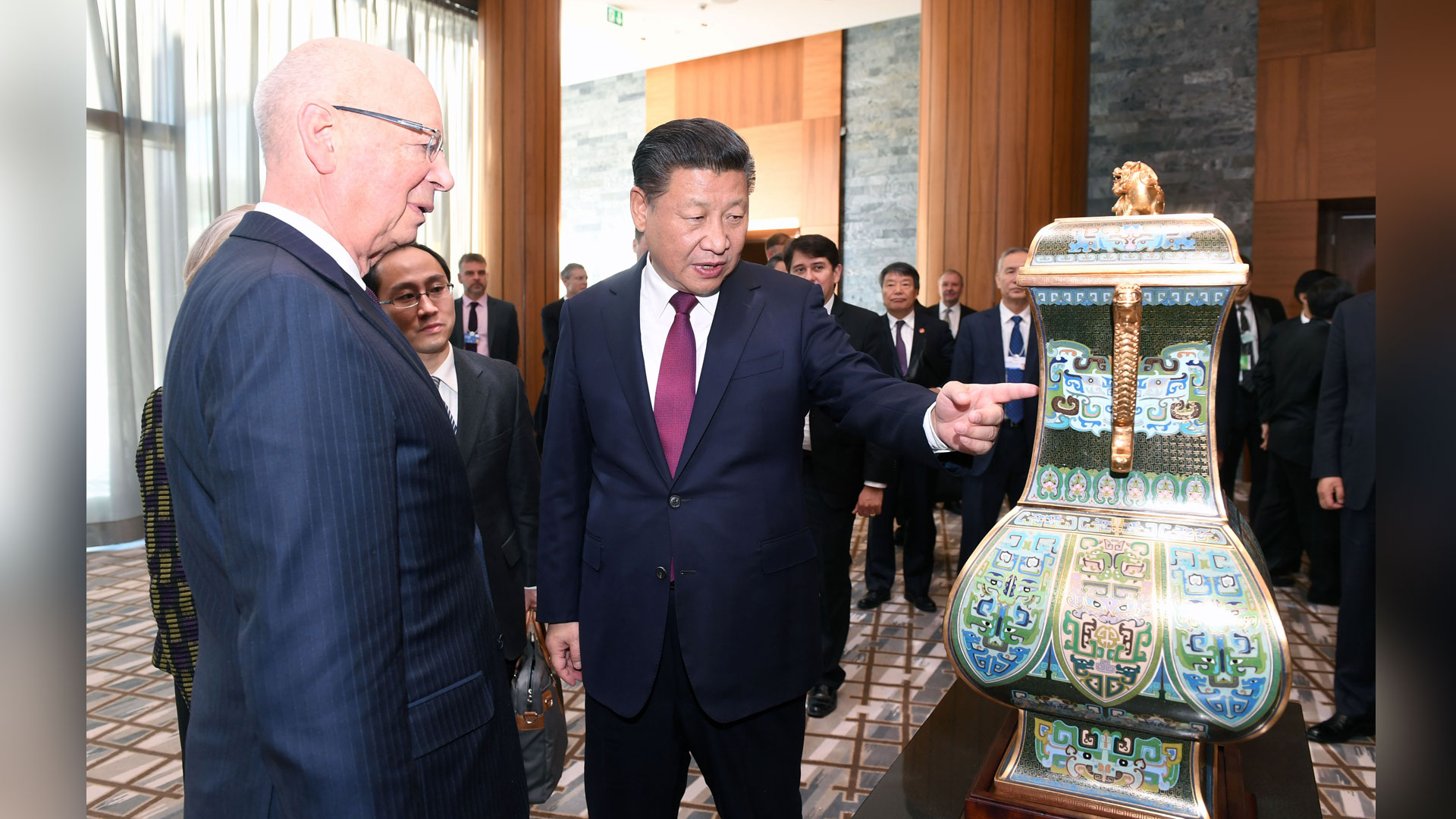 1月17日,國(guó)家主席習(xí)近平在瑞士達(dá)沃斯會(huì)見世界經(jīng)濟(jì)論壇主席施瓦布。這是習(xí)近平向施瓦布介紹中華人民共和國(guó)贈(zèng)送給世界經(jīng)濟(jì)論壇的四面方尊。新華社記者 饒愛民 攝2017-01-18