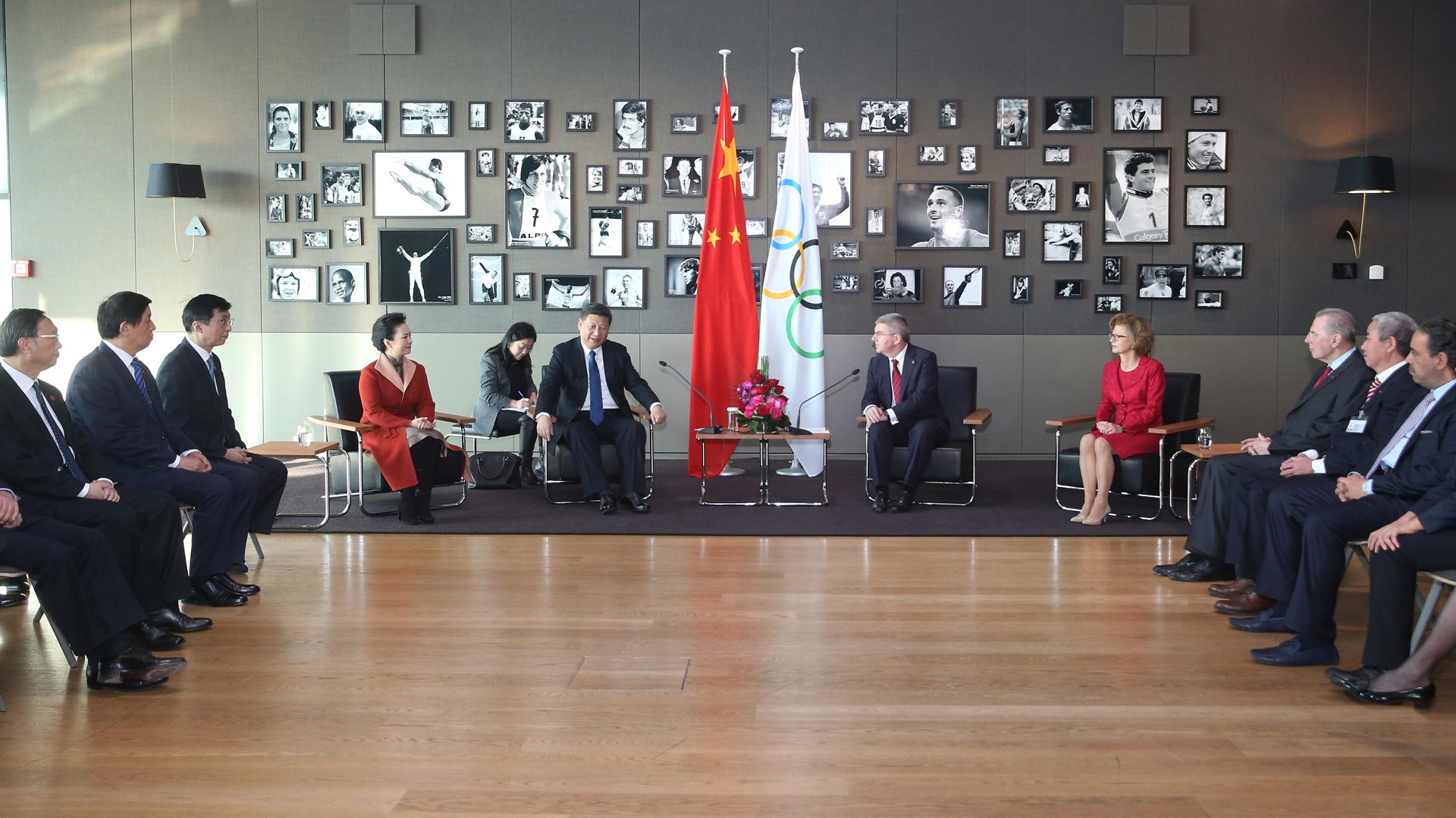 1月18日,國(guó)家主席習(xí)近平在瑞士洛桑國(guó)際奧林匹克博物館會(huì)見國(guó)際奧林匹克委員會(huì)主席巴赫。這是習(xí)近平和夫人彭麗媛與巴赫夫婦及部分國(guó)際奧委會(huì)中國(guó)委員在國(guó)際奧委會(huì)會(huì)旗前合影。新華社記者 蘭紅光 攝2017-01-19