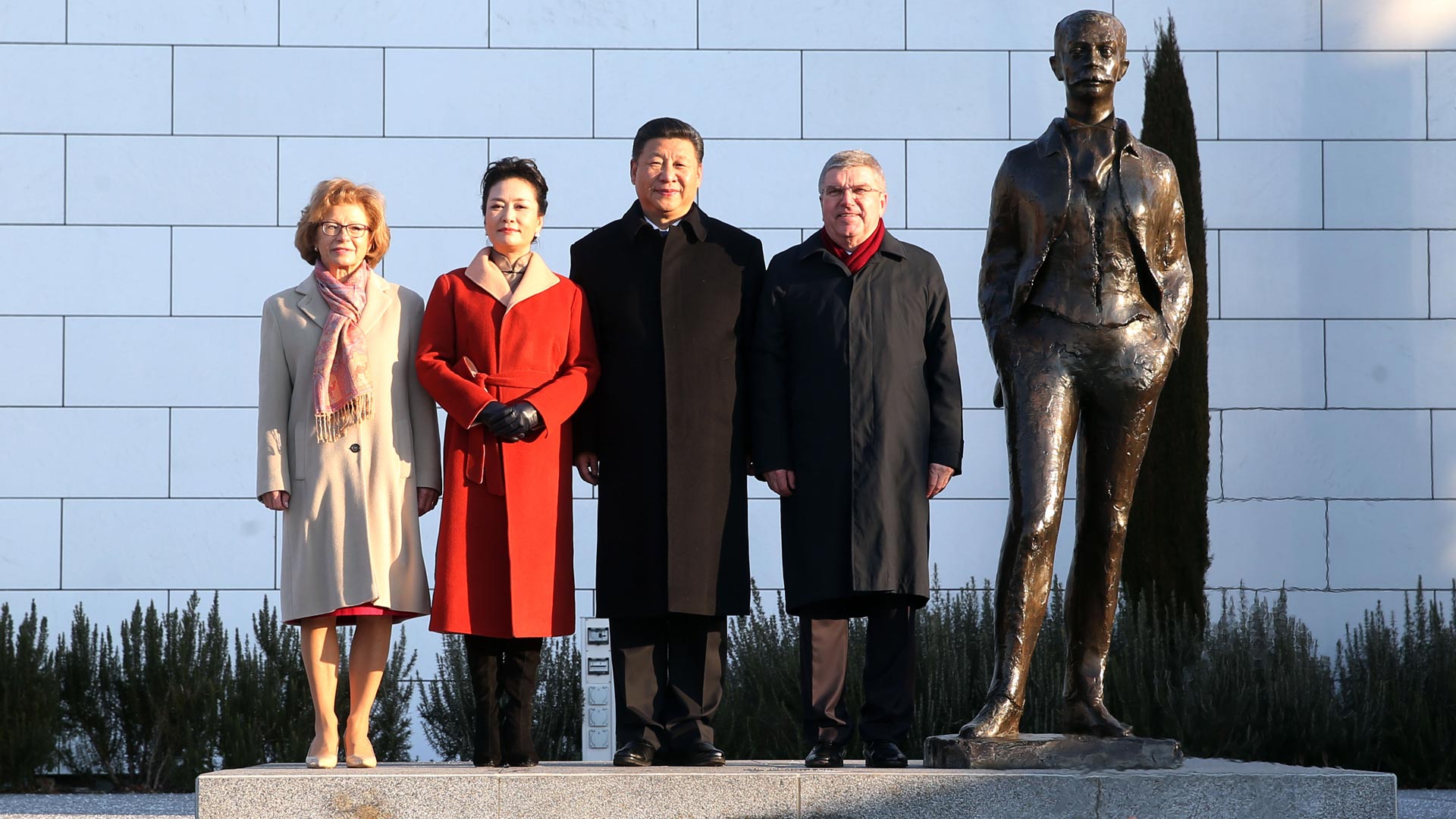 1月18日,國(guó)家主席習(xí)近平在瑞士洛桑國(guó)際奧林匹克博物館會(huì)見國(guó)際奧林匹克委員會(huì)主席巴赫。這是習(xí)近平和夫人彭麗媛與巴赫夫婦在現(xiàn)代奧林匹克運(yùn)動(dòng)發(fā)起人顧拜旦雕像前合影。新華社記者 姚大偉 攝2017-01-19