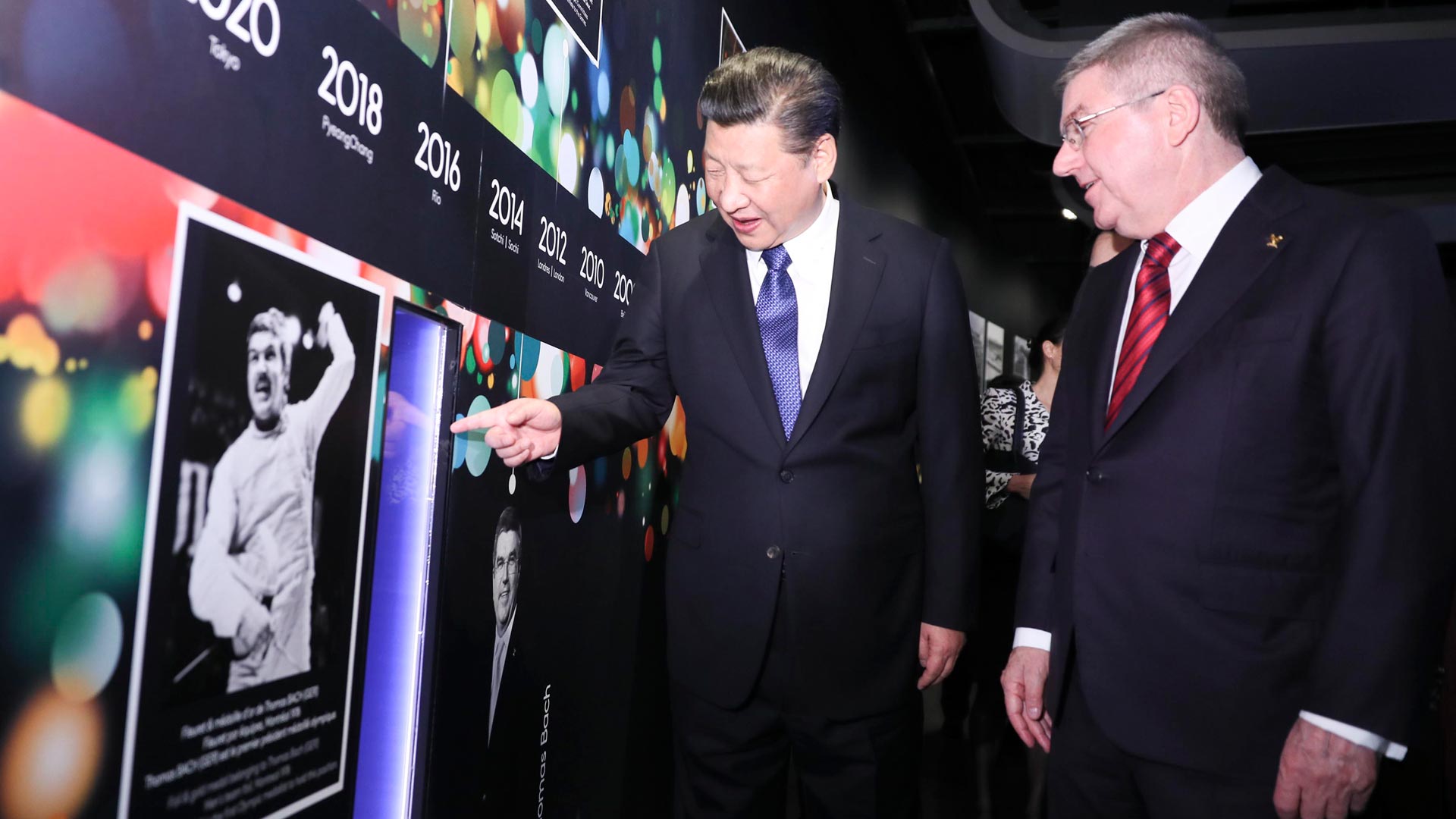 1月18日,國(guó)家主席習(xí)近平在瑞士洛桑國(guó)際奧林匹克博物館會(huì)見國(guó)際奧林匹克委員會(huì)主席巴赫。這是習(xí)近平在巴赫陪同下,參觀巴赫作為擊劍運(yùn)動(dòng)員參加奧運(yùn)會(huì)的照片。新華社記者 蘭紅光 攝2017-01-19