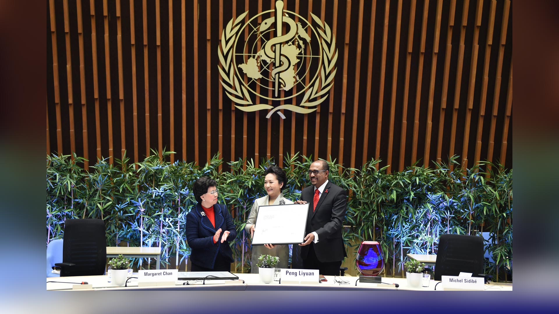 1月18日,國(guó)家主席習(xí)近平夫人、世界衛(wèi)生組織結(jié)核病和艾滋病防治親善大使彭麗媛應(yīng)世界衛(wèi)生組織總干事陳馮富珍和聯(lián)合國(guó)艾滋病規(guī)劃署執(zhí)行主任西迪貝邀請(qǐng),在瑞士日內(nèi)瓦出席為她舉行的親善大使任期續(xù)延暨頒獎(jiǎng)儀式。這是世界衛(wèi)生組織總干事陳馮富珍向彭麗媛頒發(fā)親善大使任期續(xù)延證書。新華社記者謝環(huán)馳攝2017-01-19