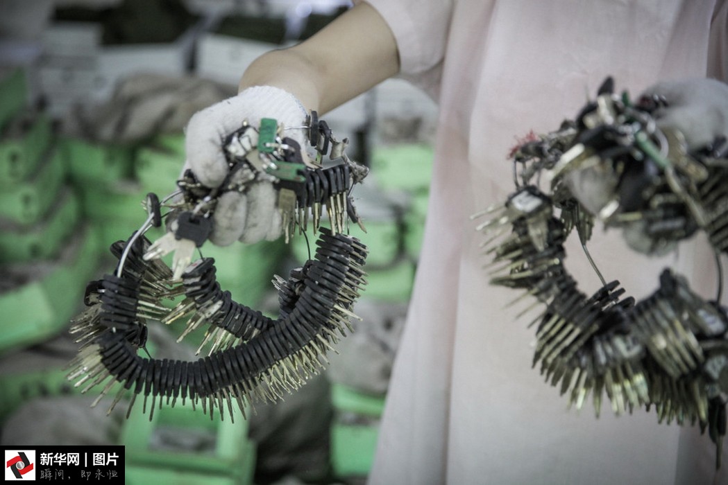 點鈔工手拿投幣箱的鑰匙。