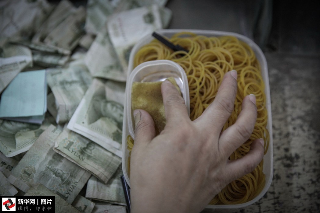 圖為帶著橡膠指套的點鈔工在點鈔。