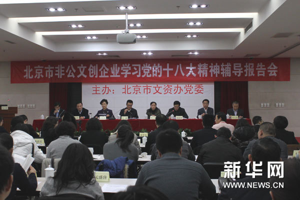 ?? 27日,北京市文資辦召開非公有制文化創(chuàng)意企業(yè)學(xué)習(xí)宣傳黨的十八大精神輔導(dǎo)報(bào)告會。圖為會議現(xiàn)場。新華網(wǎng)記者 陳元攝