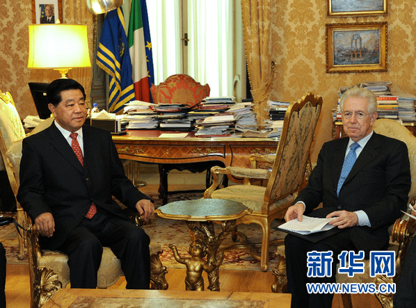 ????當(dāng)?shù)貢r(shí)間11月28日,全國政協(xié)主席賈慶林在羅馬會見意大利總理蒙蒂。(來源:新華社記者 李學(xué)仁 攝)