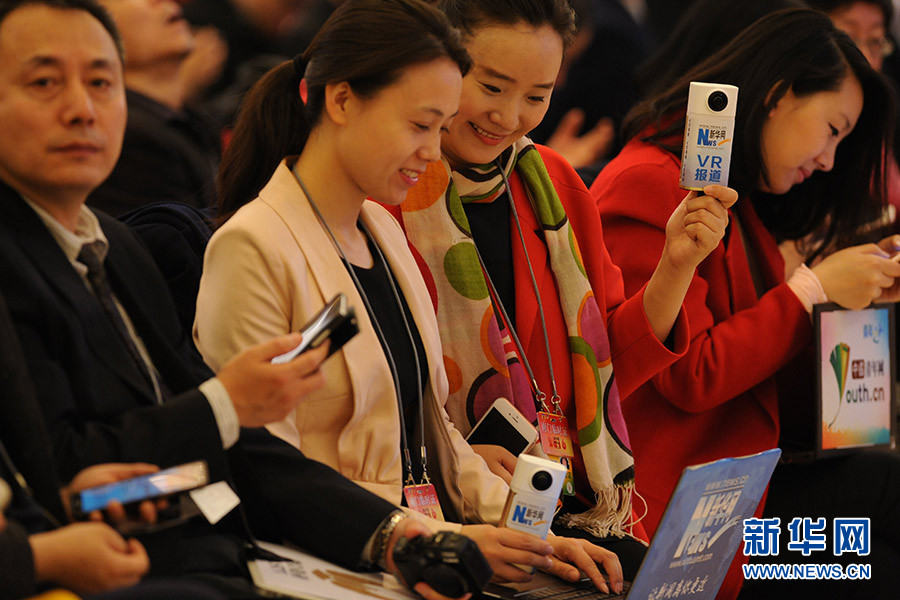 3月16日上午,國務(wù)院總理李克強在人民大會堂三樓金色大廳會見采訪十二屆全國人大四次會議的中外記者并回答記者提出的問題。圖為新華網(wǎng)記者用VR報道總理記者會現(xiàn)場。新華網(wǎng)/中國政府網(wǎng) 陳杰攝