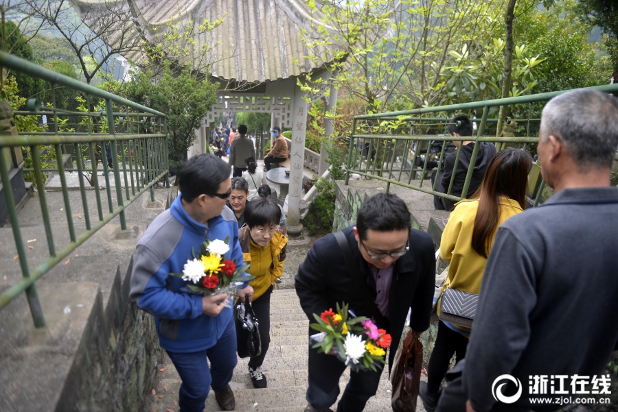 4月5日清明節(jié)上午,前往浙江省定舟山市定海區(qū)清陵掃墓人絡繹不絕,不少掃墓人用鮮花祭祀,寄托哀思懷念逝去的親人,倡導環(huán)保綠色的清明。(浙江在線拍友 胡社友 攝)