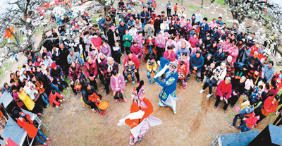 4月7日,安徽碭山縣迎來百萬畝梨花盛開,當(dāng)?shù)乩孓r(nóng)組織吹嗩吶、唱大戲、斗羊等傳統(tǒng)民俗表演,祈盼酥梨豐收。韓俊杰 王嫣 攝影報(bào)道