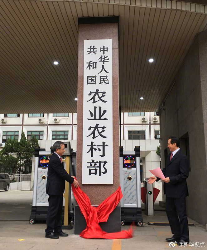 新組建的農(nóng)業(yè)農(nóng)村部4月3日正式掛牌。韓長(zhǎng)賦任部長(zhǎng)、黨組書記。(新華社“新華視點(diǎn)”微博 記者 董峻)