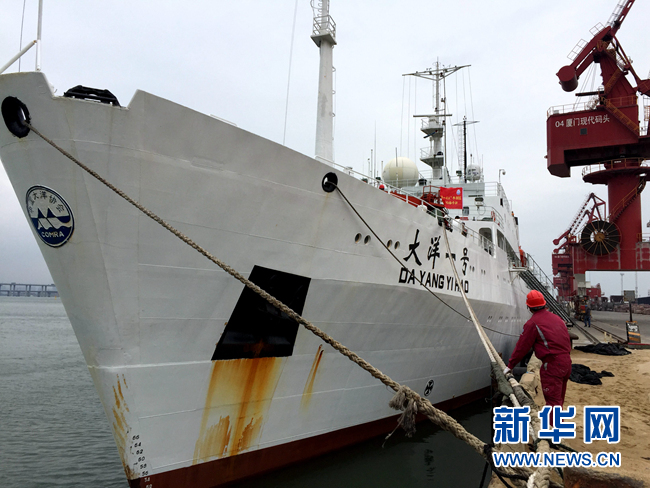 ??? 這是4月15日拍攝的??吭趶B門現(xiàn)代碼頭的“大洋一號”科考船。當日,搭載“潛龍三號”無人無纜潛水器和70名科考隊員的“大洋一號”科考船從廈門起航,奔赴南海執(zhí)行“大洋一號”綜合海試B航段科考任務(wù)。這也是目前我國最先進的自主無人潛水器“潛龍三號”首次出海。新華社記者 劉詩平 攝