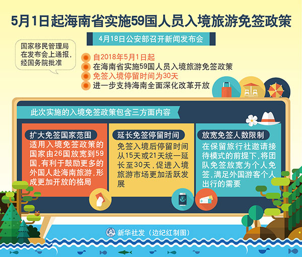 “擴(kuò)大免簽國范圍;延長免簽停留時間;放寬免簽人數(shù)限制?!?8日,公安部在京召開新聞發(fā)布會,國家移民管理局在發(fā)布會上通報,經(jīng)國務(wù)院批準(zhǔn),自2018年5月1日起,在海南省實(shí)施59國人員入境旅游免簽政策,進(jìn)一步支持海南全面深化改革開放。