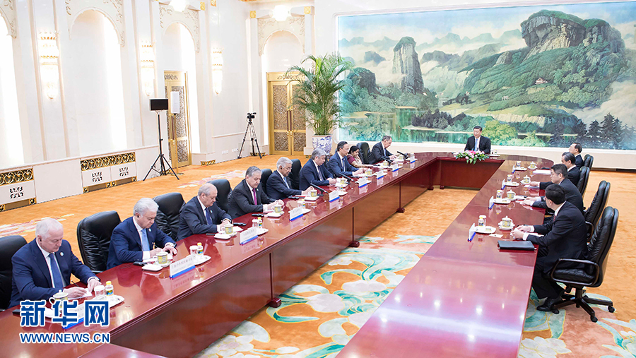 4月23日,國家主席習(xí)近平在北京人民大會堂集體會見來華出席上海合作組織成員國外長理事會會議的俄羅斯外長拉夫羅夫、印度外長斯瓦拉杰、哈薩克斯坦外長阿布德拉赫曼諾夫、吉爾吉斯斯坦外長阿布德爾達(dá)耶夫、巴基斯坦外長阿西夫、塔吉克斯坦外長阿斯洛夫、烏茲別克斯坦外長卡米洛夫、上海合作組織秘書長阿利莫夫、上海合作組織地區(qū)反恐怖機(jī)構(gòu)執(zhí)委會主任瑟索耶夫。新華社記者 李濤 攝