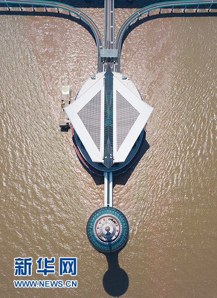 鳥瞰杭州灣跨海大橋海上觀光服務(wù)平臺(4月19日無人機(jī)航拍)。新華社記者 翁忻旸 攝