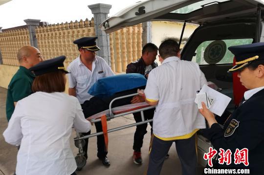 患病旅客被轉(zhuǎn)移至救護車 雷祖勝 攝