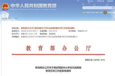 4月20日,教育部發(fā)布《關(guān)于做好預防中小學生沉迷網(wǎng)絡教育引導工作的緊急通知》。 教育部官網(wǎng)截圖