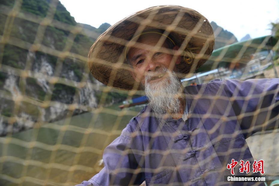 5月5日,桂林陽(yáng)朔,79歲的黃月創(chuàng)正在表演漓江傳統(tǒng)漁事。黃月創(chuàng)18歲就在漓江捕魚為生,隨著桂林旅游業(yè)的發(fā)展,他成為了再現(xiàn)“漓江漁火”擺拍模特中的一員。中新社記者 俞靖 攝