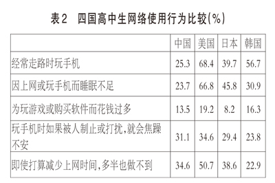 如果中學生的在線活動影響了現(xiàn)實生活,并引發(fā)沖突,就需要給予引導。由表2的數(shù)據(jù)可見,25.3%的中國高中生經(jīng)常走路時玩手機,低于其他三國,美國、韓國和日本依次為68.4%、56.7%和39.7%;23.7%的中國高中生因上網(wǎng)或玩手機而睡眠不足,低于其他三國,美國、日本和韓國依次為66.8%、45.8%和30.9%;13.5%的中國高中生因玩游戲或購買軟件而花錢過多,在四國中居第三,美國和韓國依次為19.2%和16.3%,分別比中國高5.7和2.8個百分點,日本為8.2%,比中國低5.3個百分點??梢?,美國高中生網(wǎng)絡行為影響現(xiàn)實生活的最多,而中國高中生比較理性。