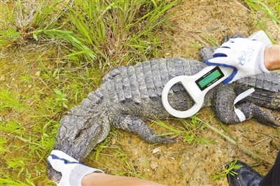 汪仁平說,2006年放歸的一條雄性揚(yáng)子鱷走出了放歸區(qū)域,跑到3公里外一個魚塘筑巢。“通過無線電發(fā)射器,這條揚(yáng)子鱷被找到了?!?/p>