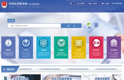 中國法律服務(wù)網(wǎng)(www.12348.gov.cn)由部、省級兩級平臺組成,包括門戶網(wǎng)站、微信公眾號和移動客戶端。記者從司法部發(fā)布會上了解到,中國法律服務(wù)網(wǎng)整合了38萬多家法律服務(wù)機構(gòu)和139萬多名法律服務(wù)人員的數(shù)據(jù),提供咨詢、查詢和征集等功能。