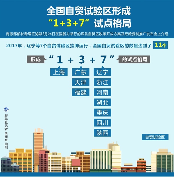 新華社北京5月24日電(記者郁瓊源)商務(wù)部部長助理任鴻斌5月24日在國新辦舉行的深化自貿(mào)區(qū)改革開放方案及經(jīng)驗復制推廣發(fā)布會上介紹,2017年,遼寧等7個自貿(mào)試驗區(qū)掛牌運行,全國自貿(mào)試驗區(qū)的數(shù)量達到了11個,形成“1+3+7”的試點格局。