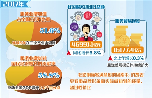 服務業(yè)是現(xiàn)代化經(jīng)濟體系建設的關鍵領域。統(tǒng)計數(shù)據(jù)顯示,2017年,服務業(yè)增加值占全國GDP比重為51.6%,連續(xù)5年在三次產(chǎn)業(yè)中領跑,服務業(yè)增長對國民經(jīng)濟增長的貢獻率為58.8%,拉動全國GDP增長4.0個百分點。