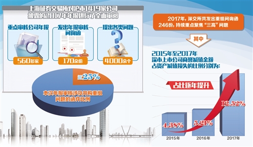 隨著上市公司年報(bào)披露季結(jié)束,證券交易所對(duì)公司的年報(bào)審核也隨之進(jìn)入高峰。目前,審核工作基本完成。上海證券交易所全面審閱了滬市1419家公司披露的2017年年報(bào),重點(diǎn)審核了560多家公司年報(bào),發(fā)出年報(bào)審核問(wèn)詢(xún)函170余份,提出各類(lèi)問(wèn)題4000余個(gè),全部審核問(wèn)詢(xún)函均對(duì)外公開(kāi)。值得關(guān)注的是,“三高”(高估值、高商譽(yù)、高業(yè)績(jī))并購(gòu)后遺癥十分明顯。