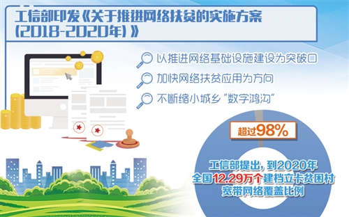工業(yè)和信息化部網(wǎng)站6月6日顯示,工信部近日印發(fā)《關(guān)于推進(jìn)網(wǎng)絡(luò)扶貧的實(shí)施方案(2018—2020年)》,要求以推進(jìn)網(wǎng)絡(luò)基礎(chǔ)設(shè)施建設(shè)為突破口,加快網(wǎng)絡(luò)扶貧應(yīng)用為方向,不斷縮小城鄉(xiāng)“數(shù)字鴻溝”。《方案》提出,到2018年,國(guó)家“十三五”規(guī)劃綱要明確提出的“寬帶網(wǎng)絡(luò)覆蓋90%以上的貧困村”目標(biāo)提前完成;到2020年,全國(guó)12.29萬(wàn)個(gè)建檔立卡貧困村寬帶網(wǎng)絡(luò)覆蓋比例超過(guò)98%。